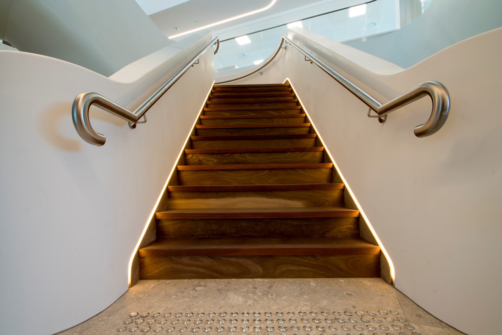 Balustrada scarii centrale constituie materializarea ideii arhitectului Daniel Noy ce a dorit redarea unui aspect dramatic, transparent si aproape fluid pentru aceasta piesa importanta a noului sediu Ego Pharmaceuticals, piesa ce uneste trei etaje. Corian® Solid Surface in culoarea Glacier White a reprodus cum nu se poate mai bine aceasta idee arhitecturala, de la tavan si pana la podea, reusind sa se imbine perfect cu celelalte materiale alese pentru interiorul cladirii.